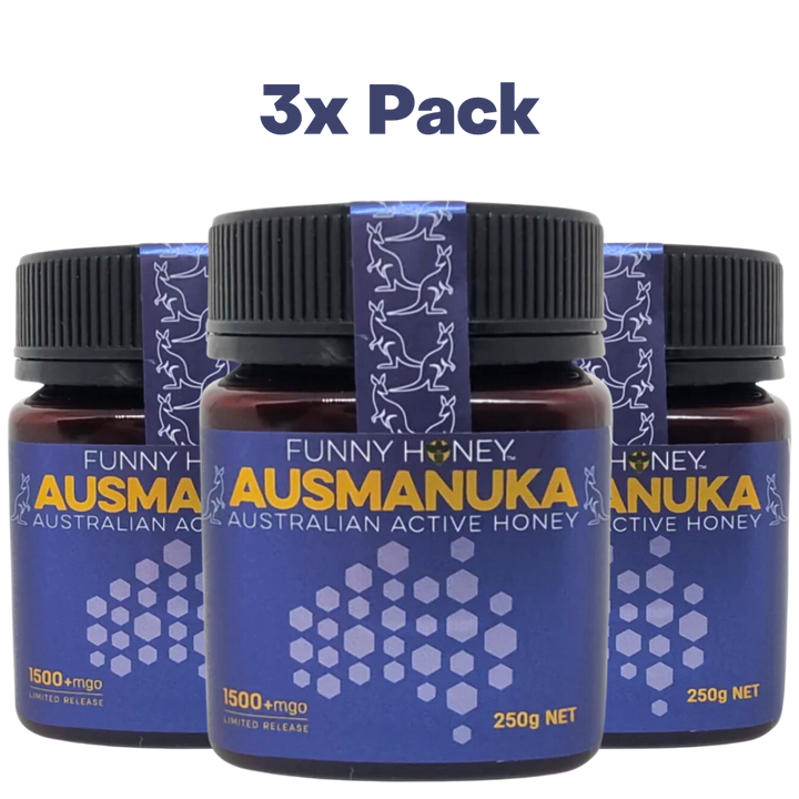 Discover our outstanding 1500+ MGO Australian Manuka Honey Value Pack, featuring three 250g jars of Premium Rare Grade Manuka Honey. With an impressive 1500+ MGO, this extraordinary honey is your go-to for medical emergencies, providing potent antiviral and antibacterial benefits. Perfect for addressing wounds, burns, infections, sore throats, colds, and flu symptoms. It also aids in digestive tract ulcers, I.B.S., and mouth/gum issues while bolstering your immune system and speeding up recovery. Experience the unparalleled power and versatility of our exceptional Manuka Honey, designed to cater to all your wellness needs.